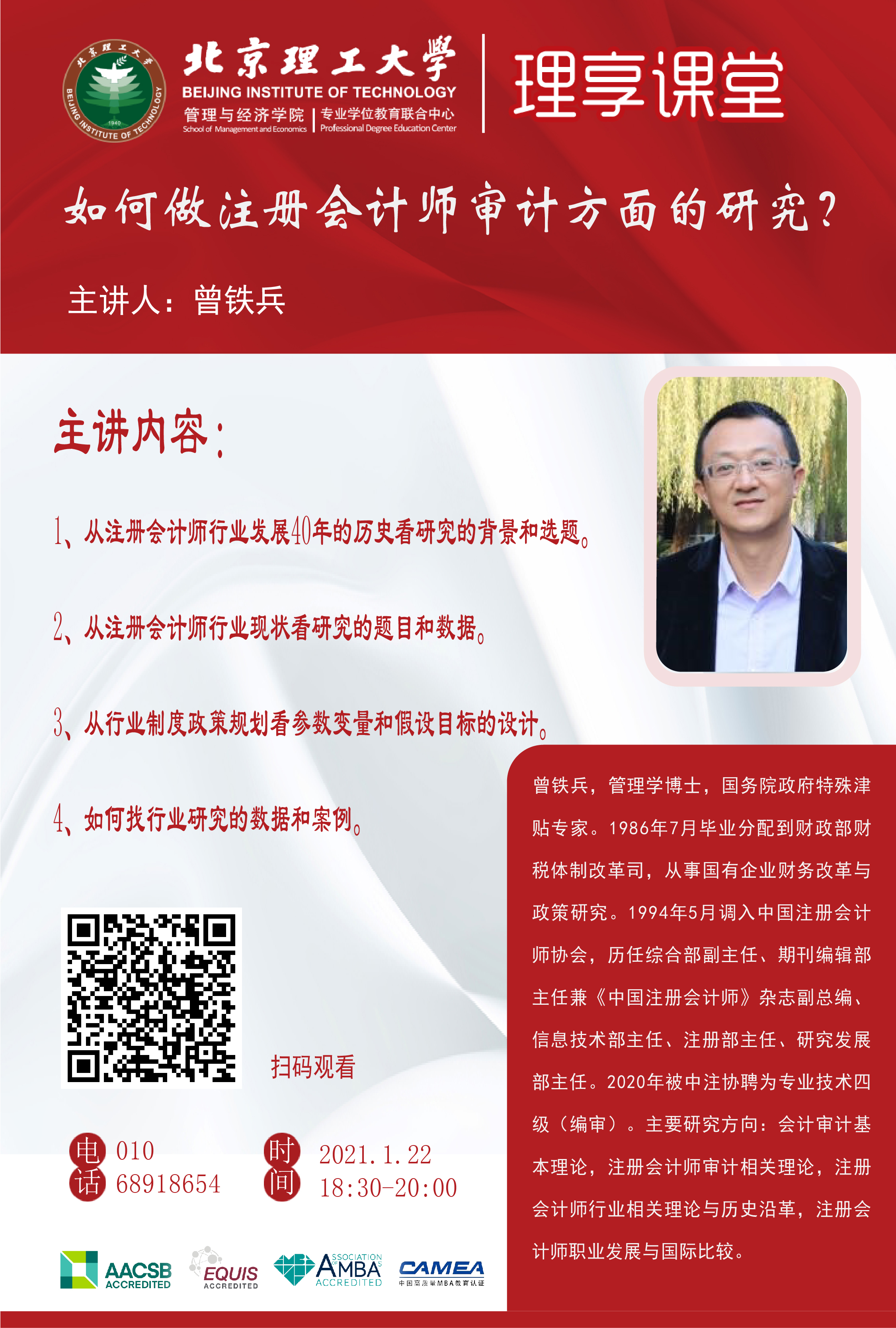 管理与经济学院专业学位项目经过多年发展,取得了长足进步,已陆续通过AMBA认证和再认证,CAMEA认证,并支撑学院通过了AACSB和EQUIS国际认证。在校学生、往期校友、以及有意向报考北京理工大学管理与经济学院的同学们均可以积极关注官方网站和校内通知,踊跃参与“理享课堂”系列讲座。相信大家一定会满载而归。